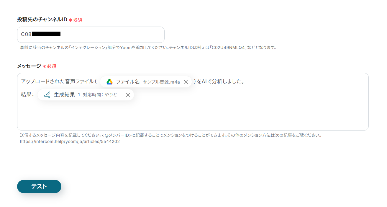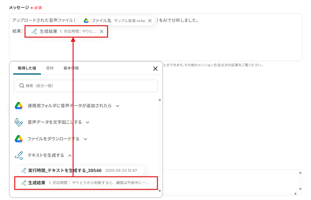- 「メッセージ」に生成結果を含む任意の内容を設定。