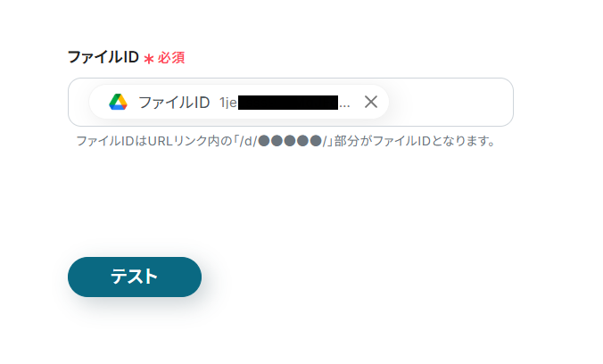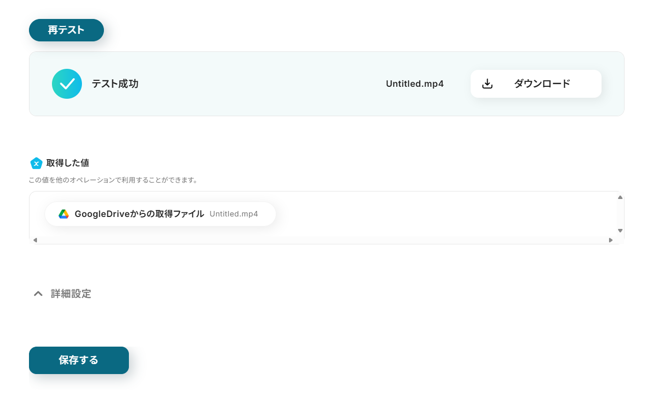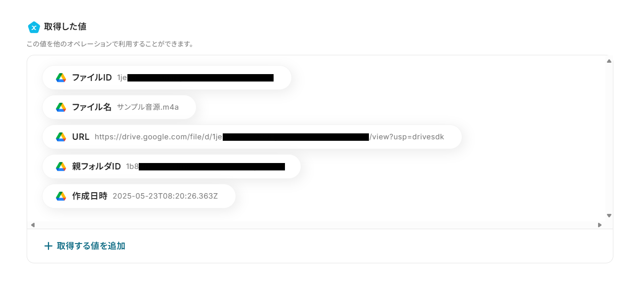 - テストに成功すると、「抽出したい項目」に設定した項目の値がファイルから抽出され、「取得した値」に追加されます。