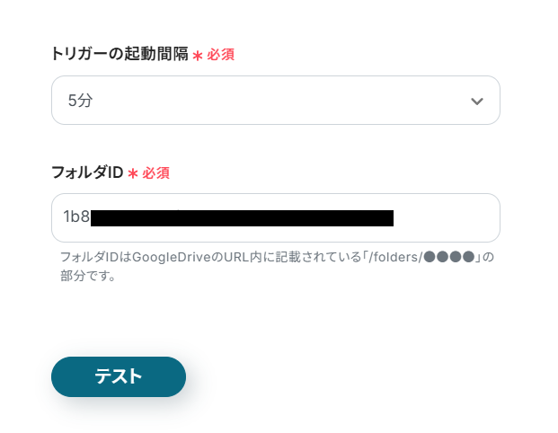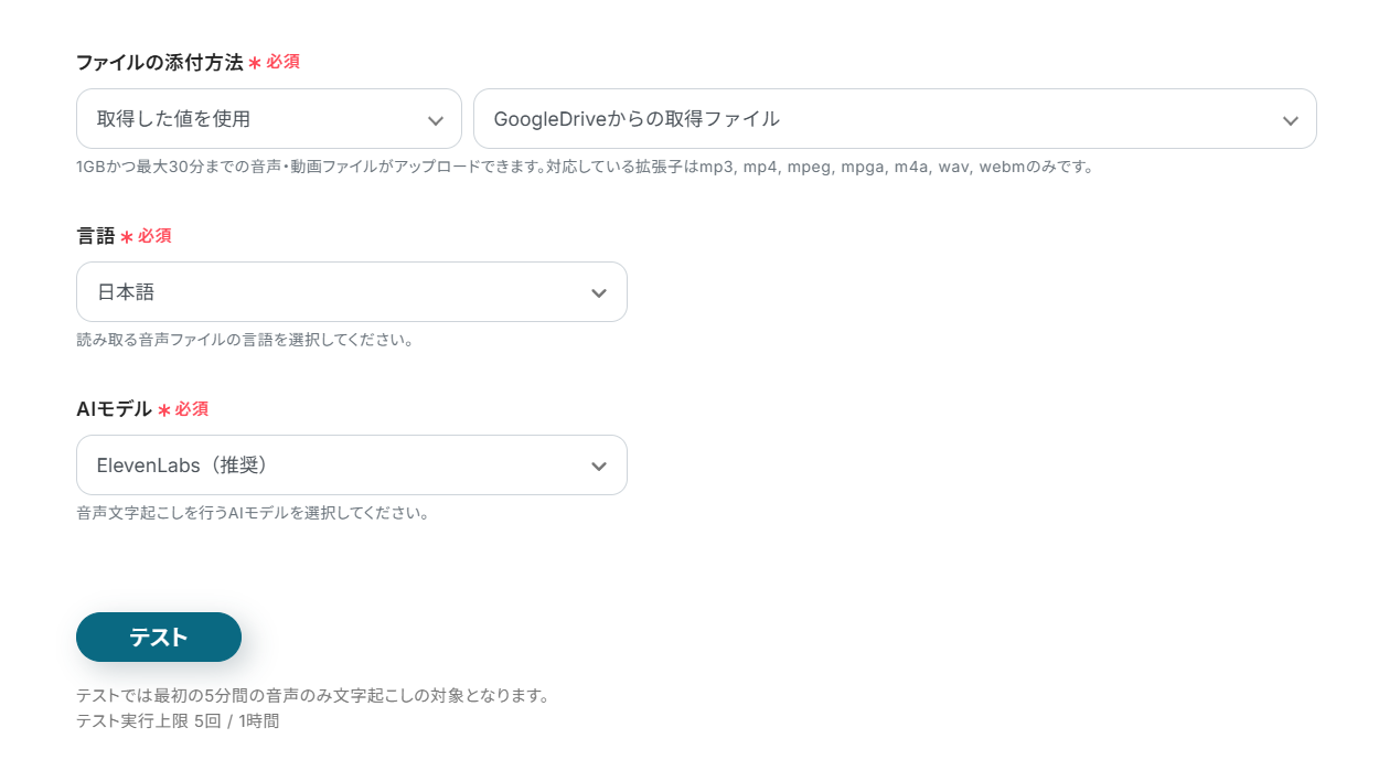 - トリガーとなるフォルダと各アクション(ファイル取得・データの文字起こし・テキスト生成・通知)の設定