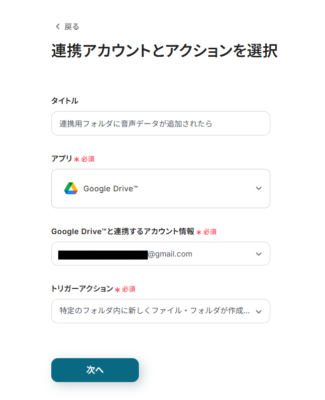 - 連携アカウントとアクションを確認し、「次へ」をクリック。