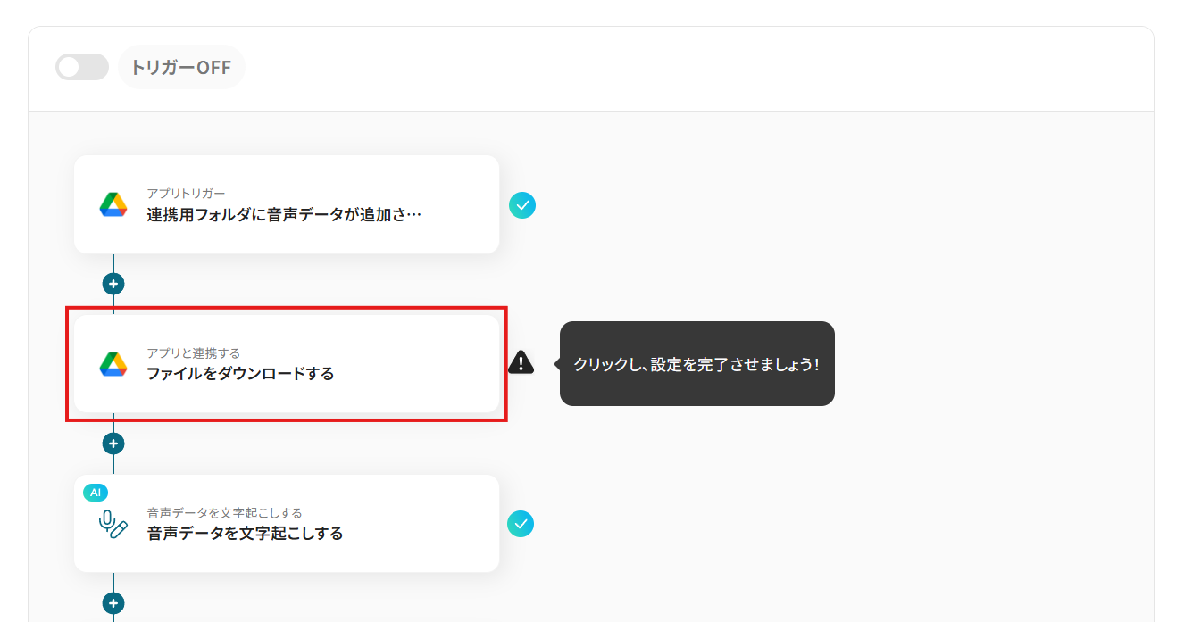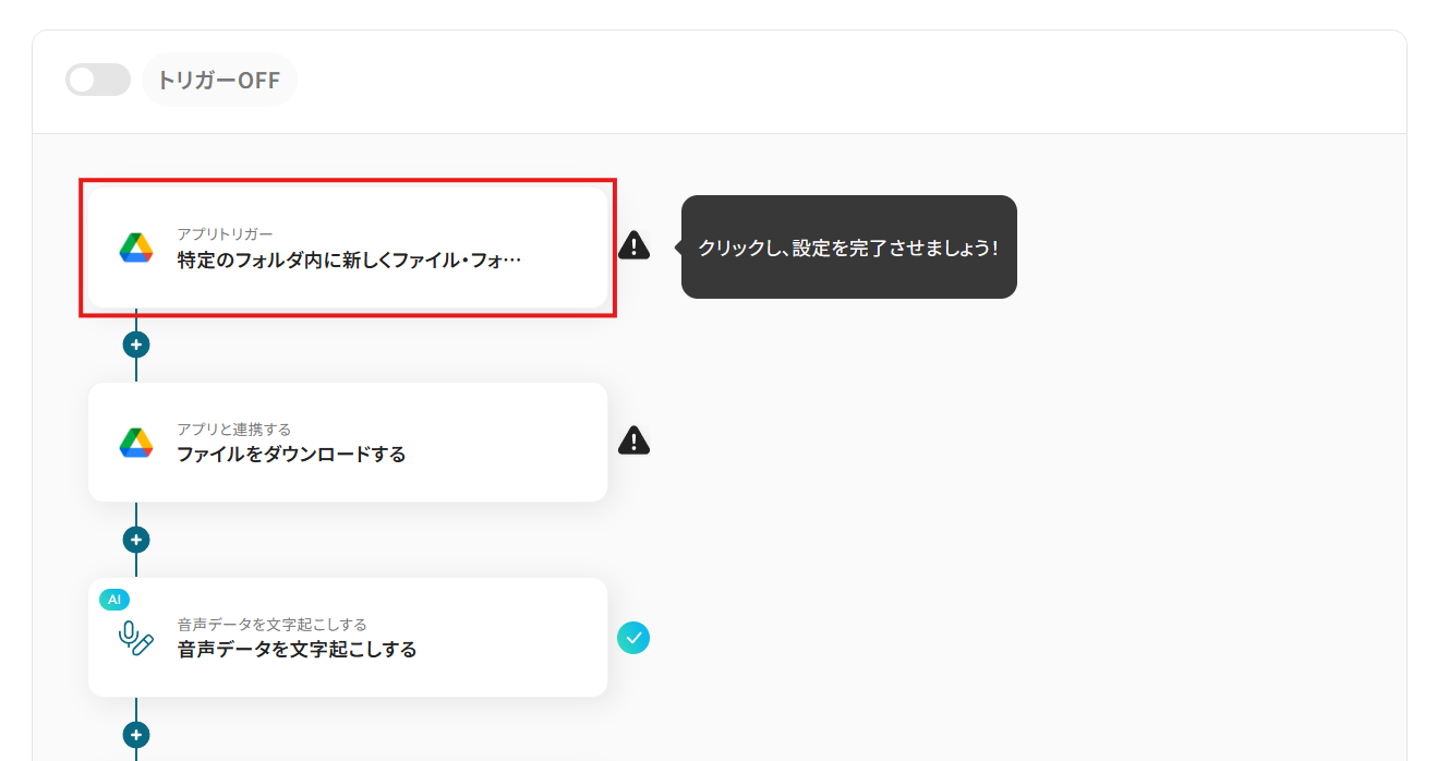 それでは代表的な例として、「Google Driveにコールセンターの音声ファイルがアップロードされた際に、AIが自動で文字起こしと解析を行い、その結果をSlackに通知するフロー」を解説していきます!