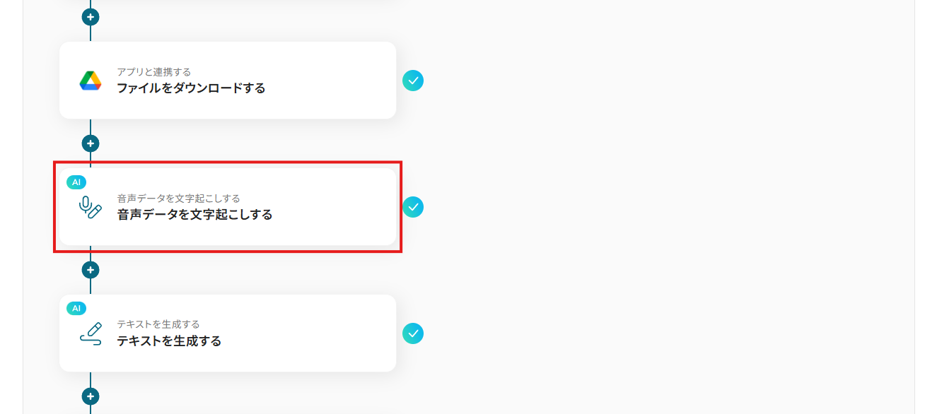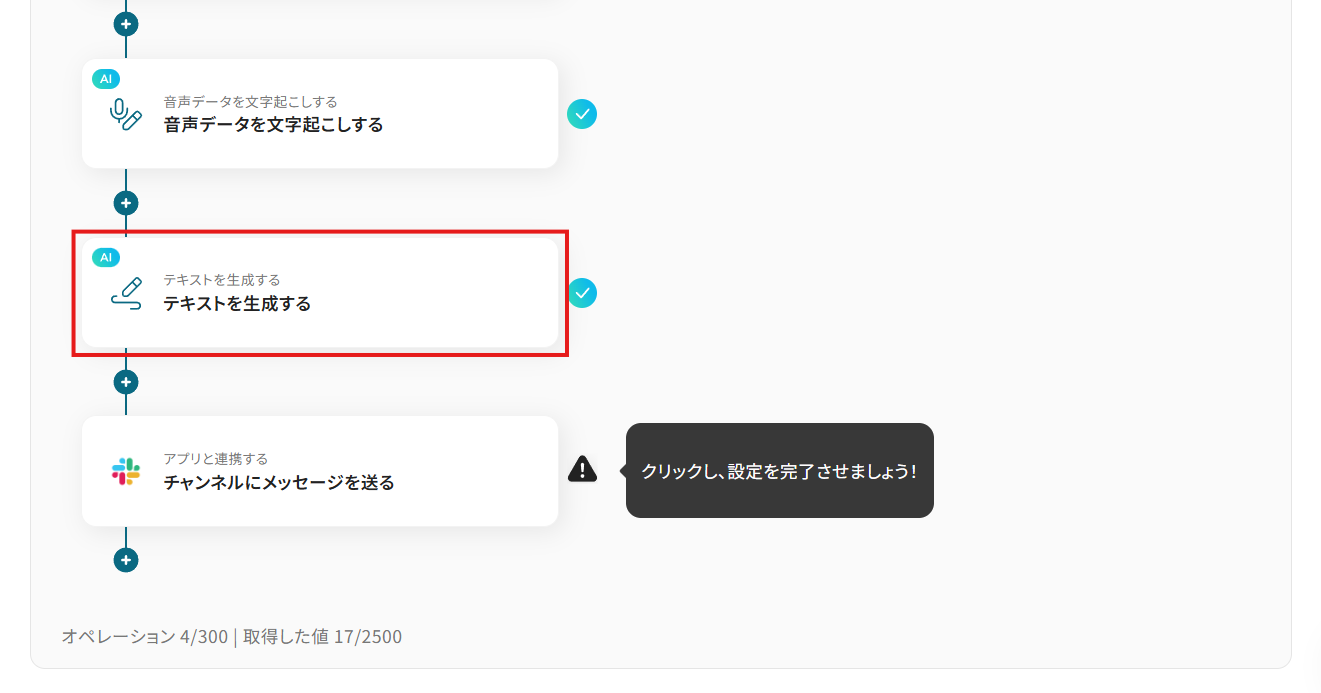 ・音声を文字起こしするAIオペレーションはチームプラン・サクセスプランでのみご利用いただける機能となっております。フリープラン・ミニプランの場合は設定しているフローボットのオペレーションはエラーとなりますので、ご注意ください。