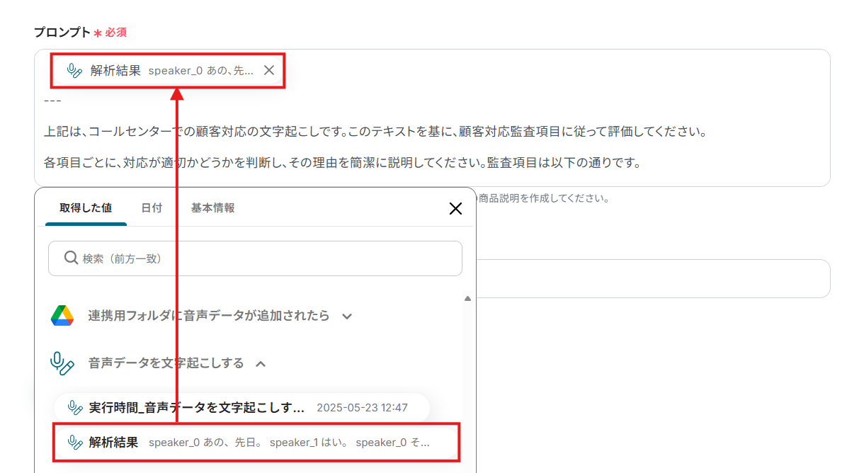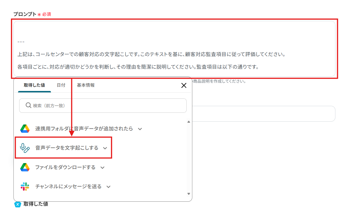 ステップ6のプロンプトと同様に、入力欄クリック時に表示される各アクションのメニューから、取得した値を追加できます。