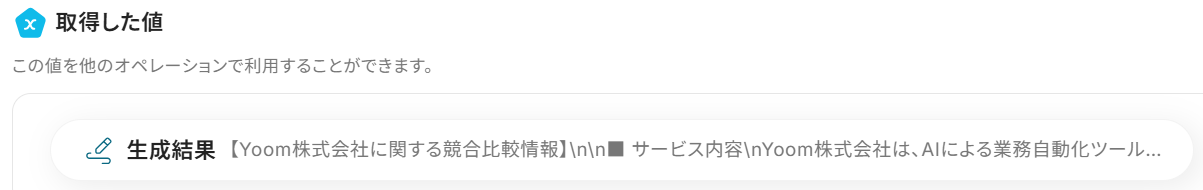 - AI機能の「テキストを生成する」オペレーションでは、プロンプトに固定の指示(例:特定の業界の競合を3社リストアップし、それぞれの強みと弱みを記述)を入力したり、Googleフォームの回答から特定の項目(例:関心のあるサービス名)を変数として埋め込むことで、調査の視点や内容をより具体的にカスタマイズできます。