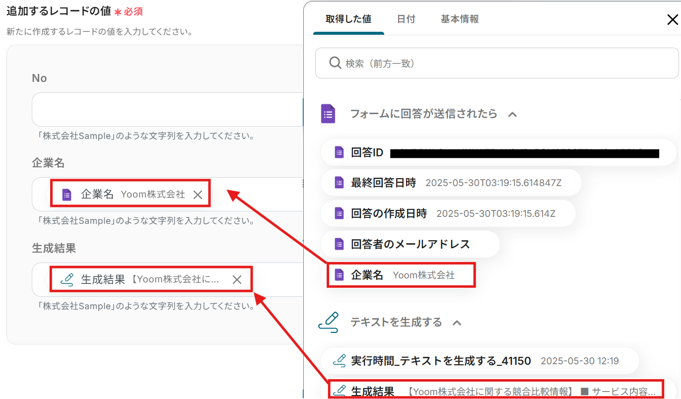 - Google スプレッドシートのオペレーション設定では、どのGoogle スプレッドシートのどのシートに追加するか、また、どの列にフォームのどの回答やAIによる要約結果を記録するかなど、追加するレコードの値を任意で設定してください。