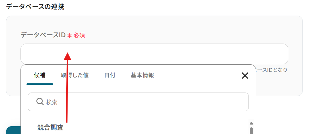 - 最後に、オペレーションでNotionを選択し、「レコードを追加する」アクションを設定し、AIが生成した競合調査の結果を指定のデータベースに追加します。