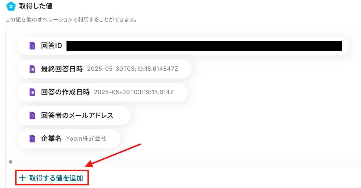 回答が足りない場合「取得する値を追加」をクリックし、ヘルプを参考に回答を取得してください。