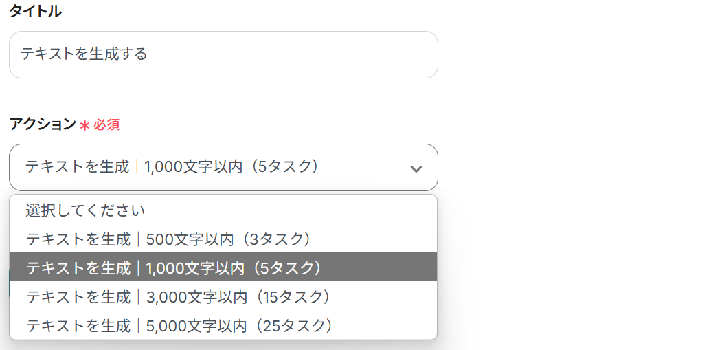 アクションは設定したいプロンプトの文字数によって、以下の中から変更し次に進んでください。