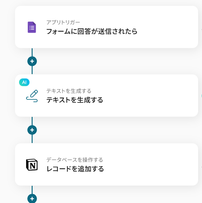 - Notionの「レコードを追加する」オペレーションでは、対象となるデータベースIDやページIDを指定するだけでなく、Googleフォームの回答内容やAI機能が生成したテキストを、Notionの各プロパティ(タイトル、テキスト、セレクトなど)に変数として割り当てることで、情報を整理された形で自動入力することが可能です。