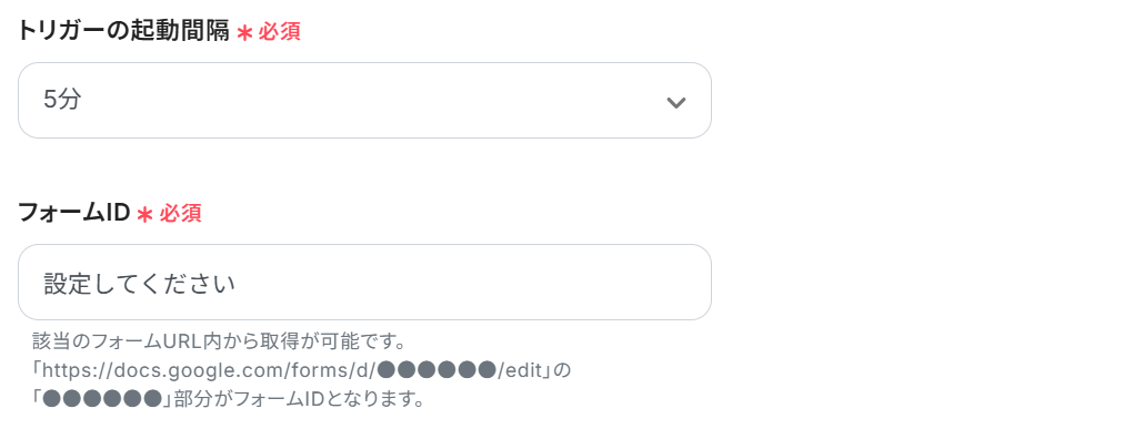 - Googleフォームのトリガー設定では、自動化の対象としたいフォームのIDを任意で設定してください。