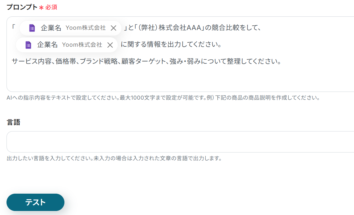 - AI機能のオペレーションでは、競合調査を依頼するプロンプトに固定の指示を入れたり、Google スプレッドシートの特定の列から取得した値を組み込むなど、より詳細な指示内容にカスタムすることが可能です。