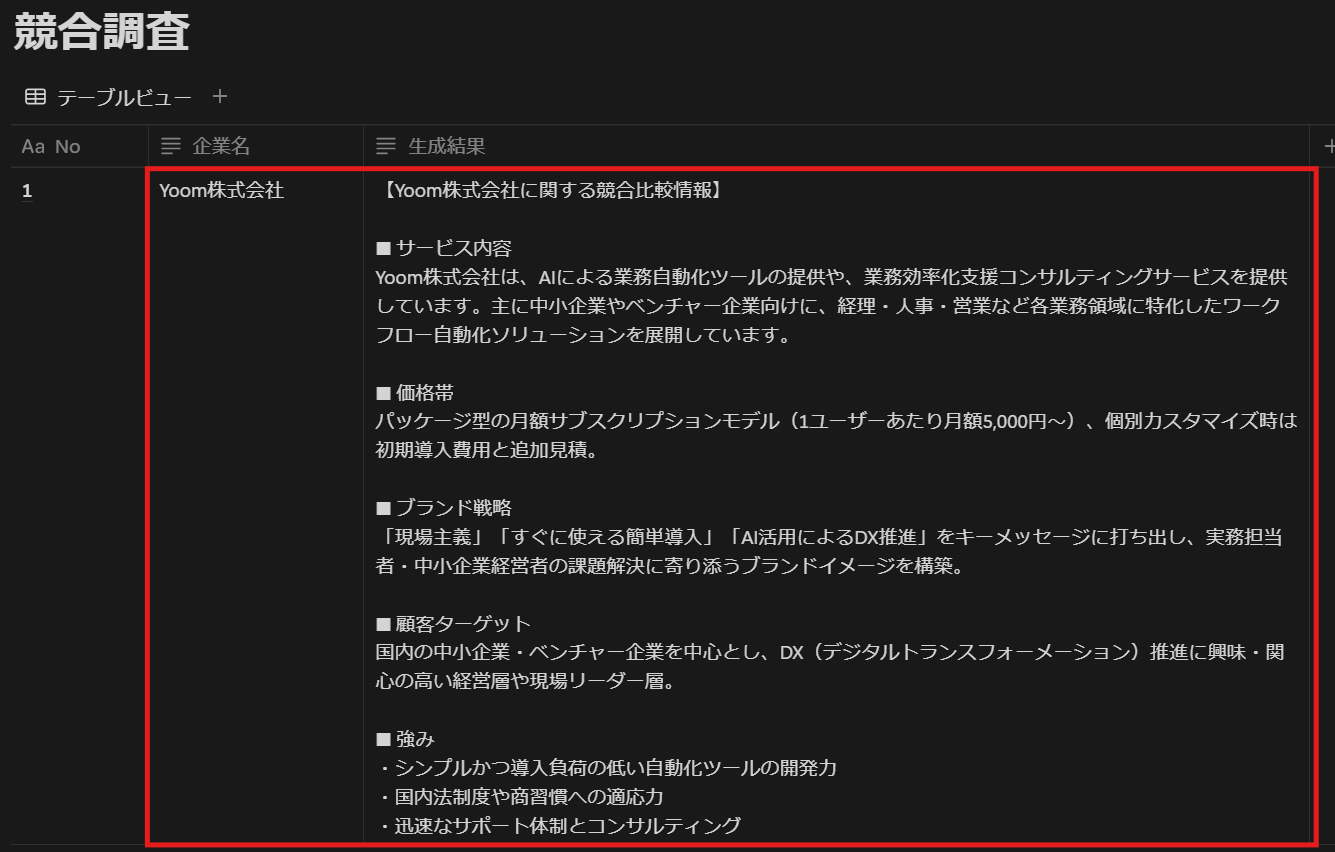 Googleフォームで収集した情報をトリガーとして、AIが自動で競合調査を行い、その分析結果をNotionのデータベースやページに整理して記録することが可能です。
