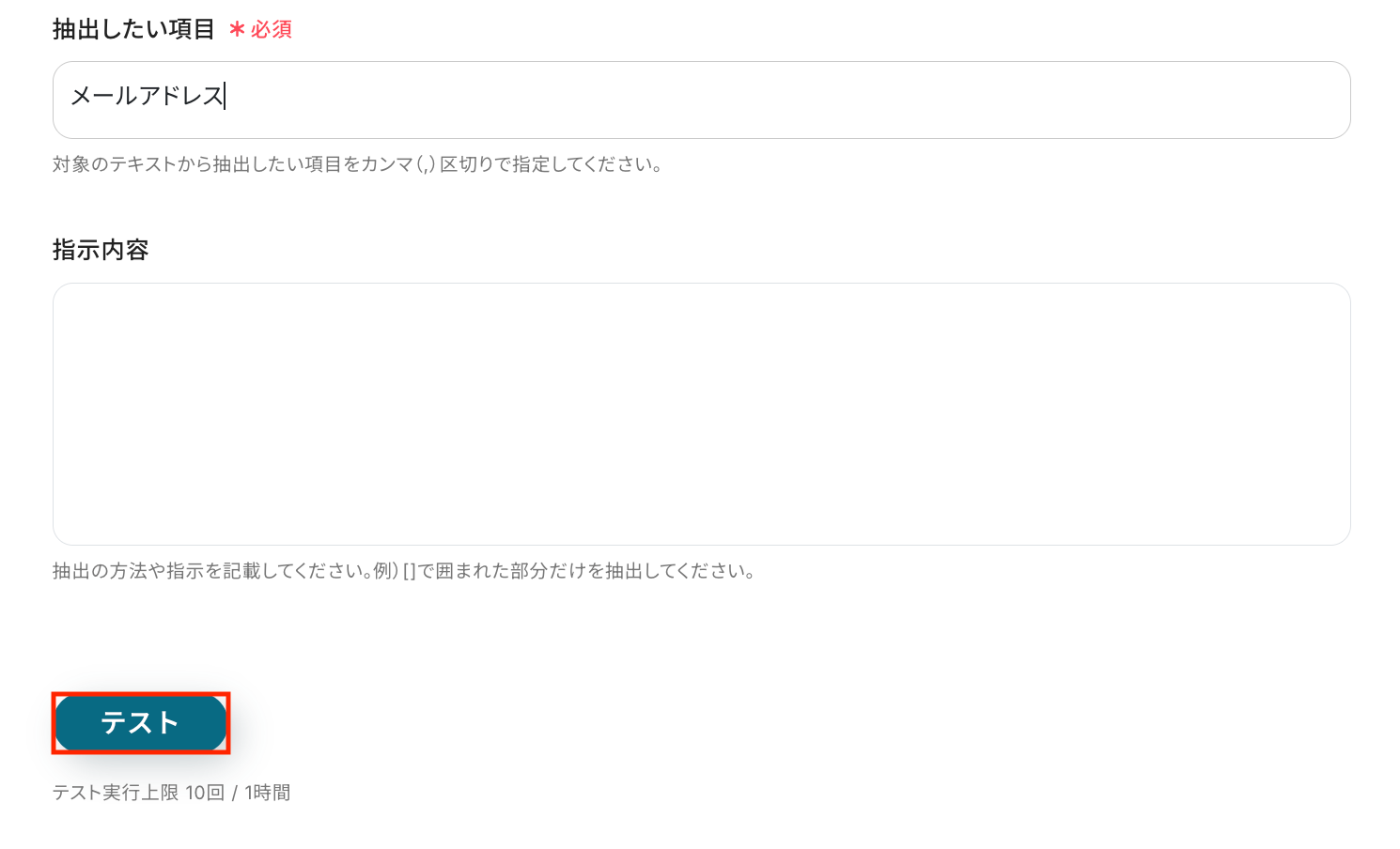入力が完了したら、設定した項目が実際に正しく抽出されるかどうかを確認するため「テスト」をクリックしましょう。