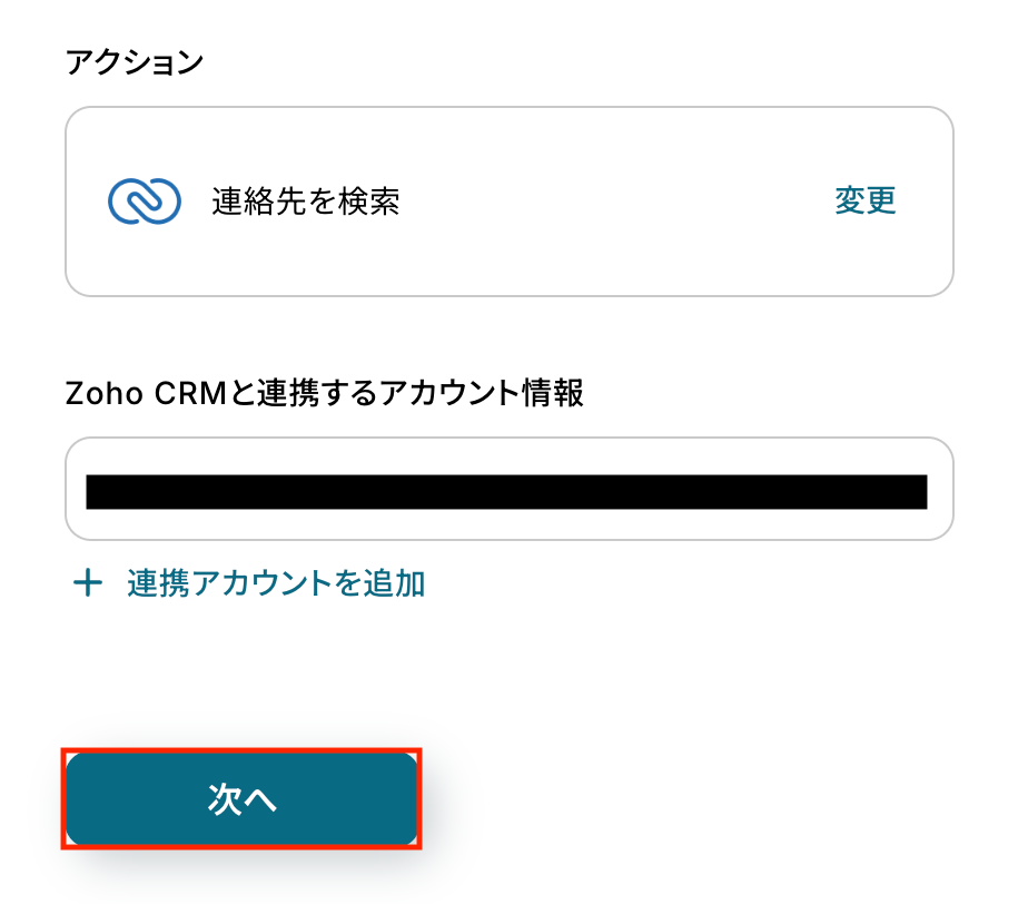 アクションはあらかじめ設定されているため、そのまま内容を確認してください。 Zoho CRMと連携するアカウント情報に問題がなければ、「次へ」をクリックします。