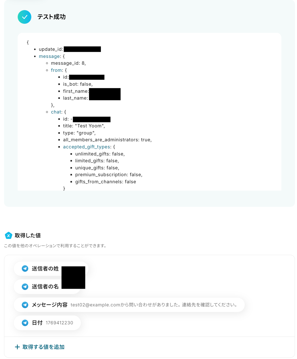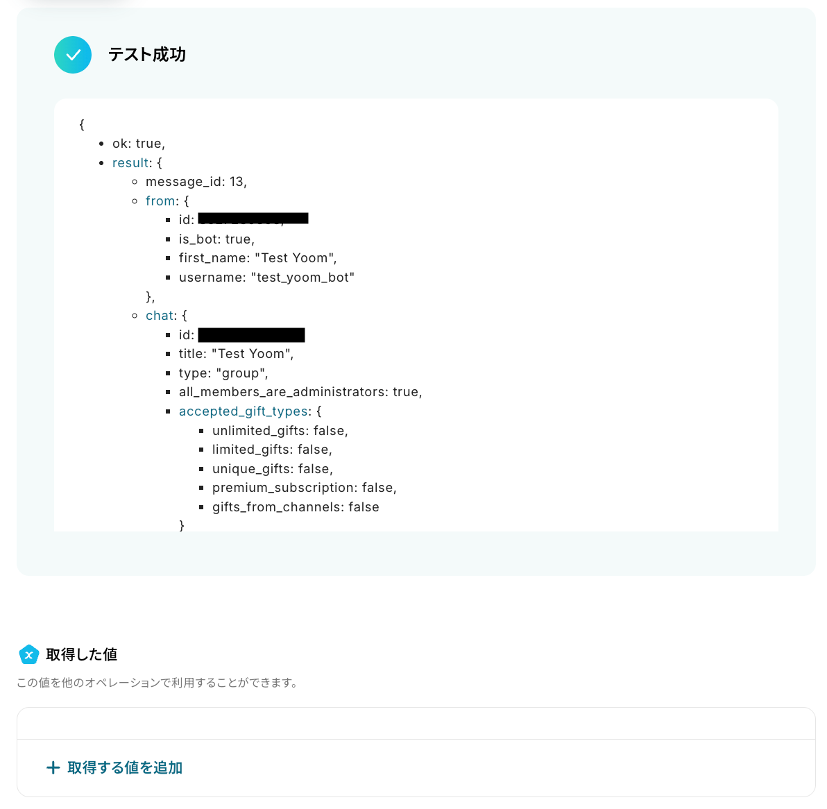 テストに成功すると、Telegramに送信されたメッセージに関する情報が表示されます。 以下の取得した値はこの後のステップで利用できます。