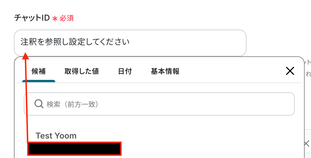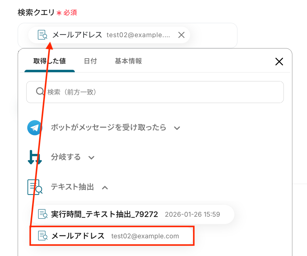 値 入力欄をクリックすると、前のステップでテキスト抽出した値が表示されます。 検索対象項目に対応する値を選択して入力しましょう。