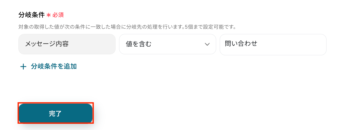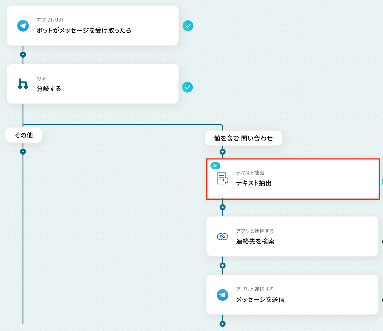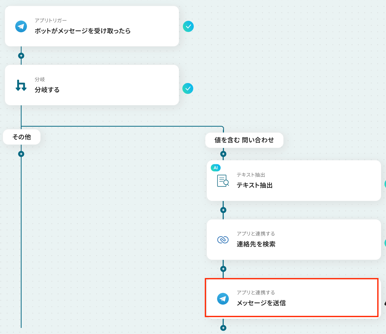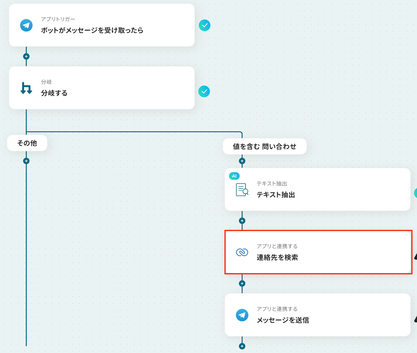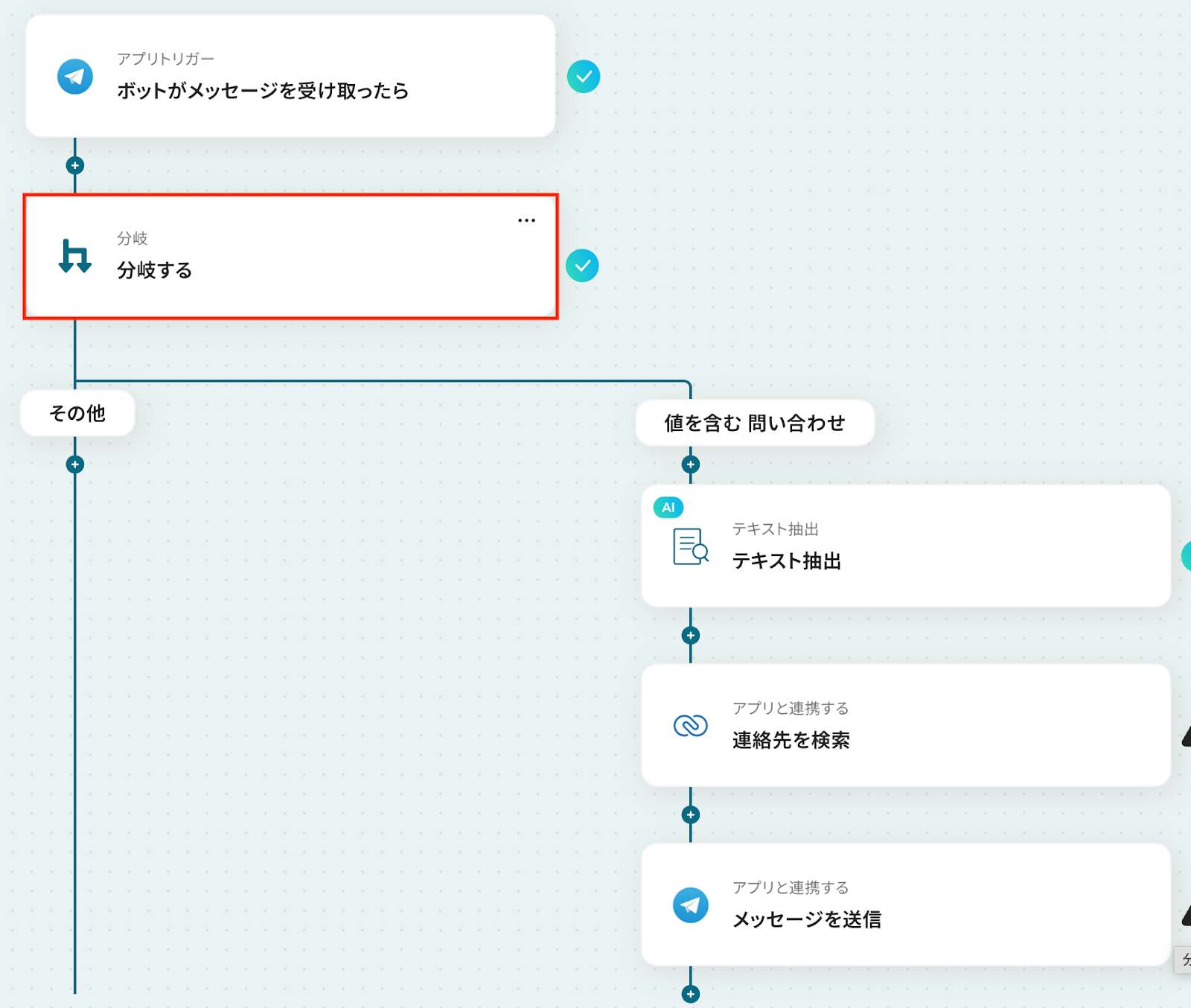 この設定により、Telegramのメッセージに「問い合わせ」というキーワードが含まれている場合のみ、分岐処理が実行されます。