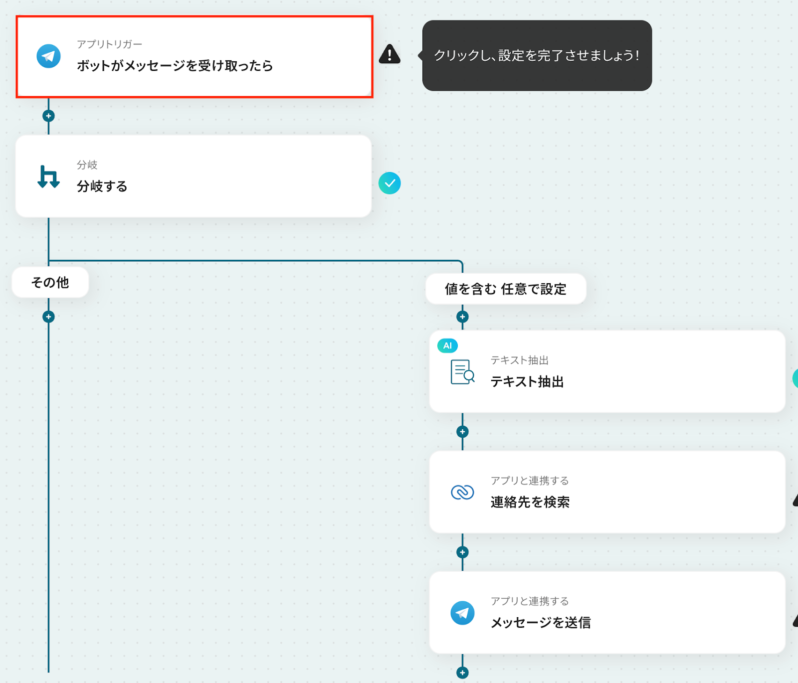 ステップ4:分岐の設定 続いて、Telegramで受信したメッセージの内容に応じてフローを分岐させる設定を行いましょう。