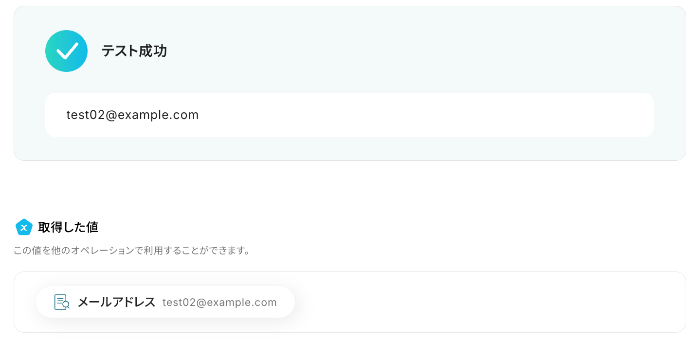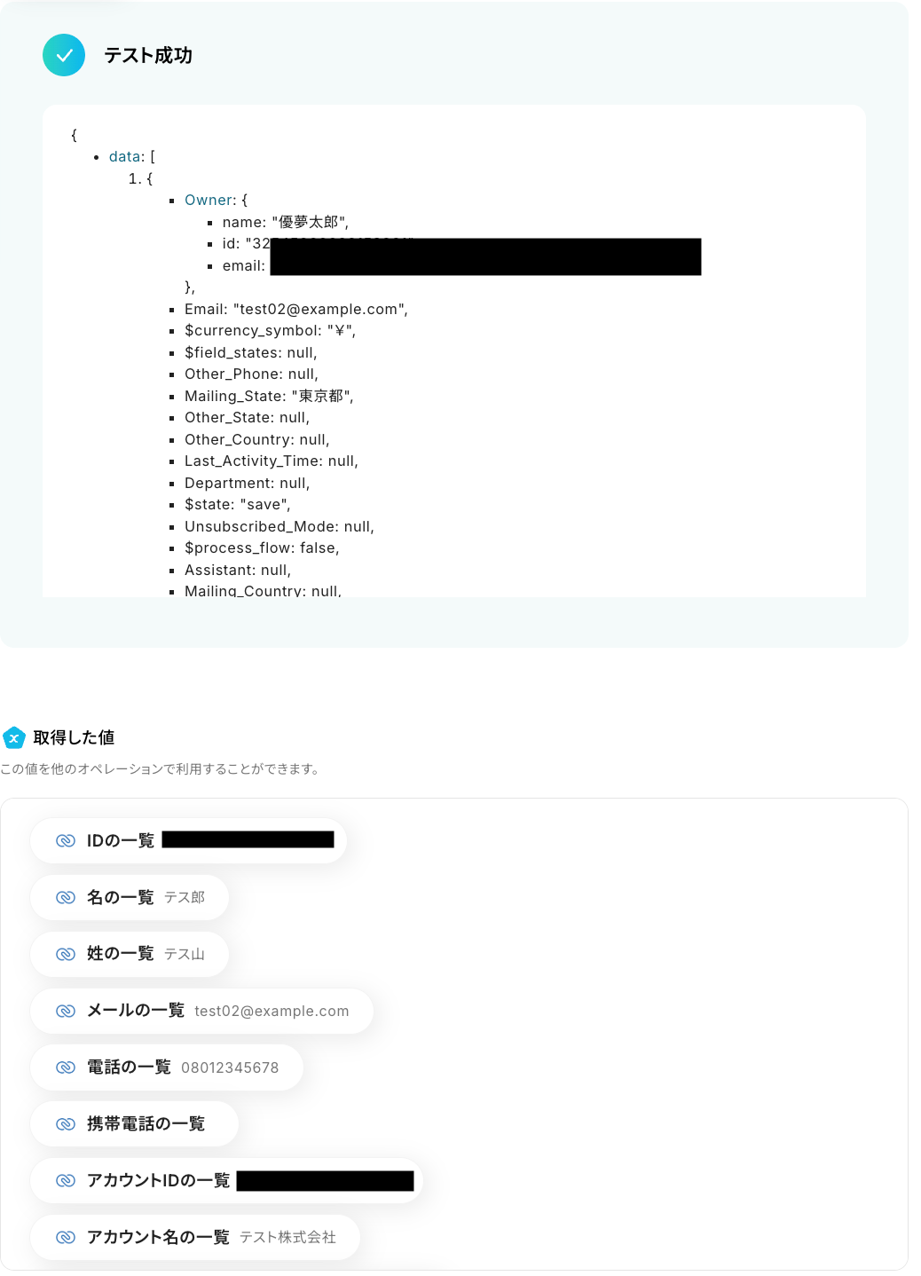 テストに成功すると、Zoho CRMで検索された連絡先に関する情報が表示されます。 以下の取得した値はこの後のステップで利用できます。 内容を確認し、「完了」をクリックします。