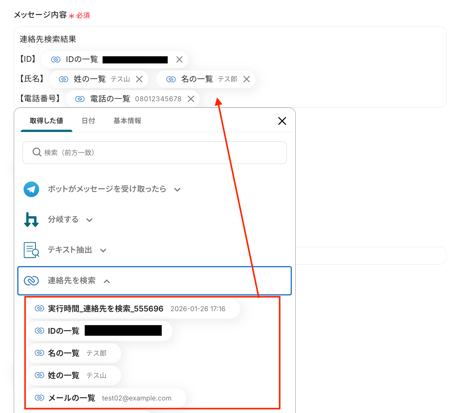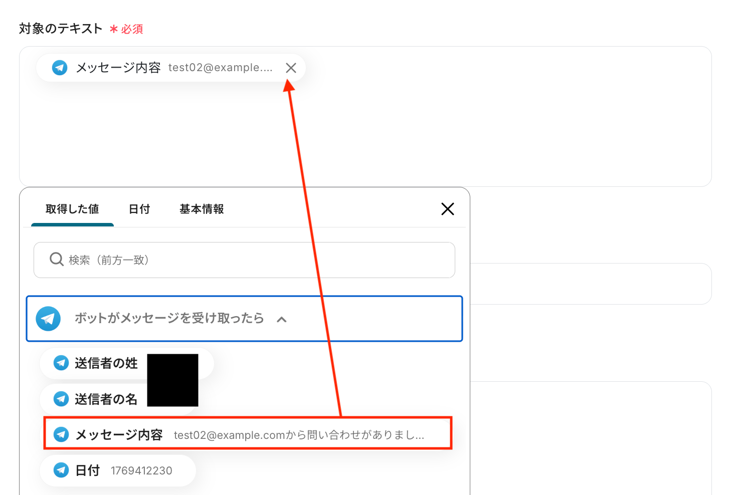 入力欄をクリックすると、前のステップでTelegramから取得した値が表示されるので、選択して入力しましょう。