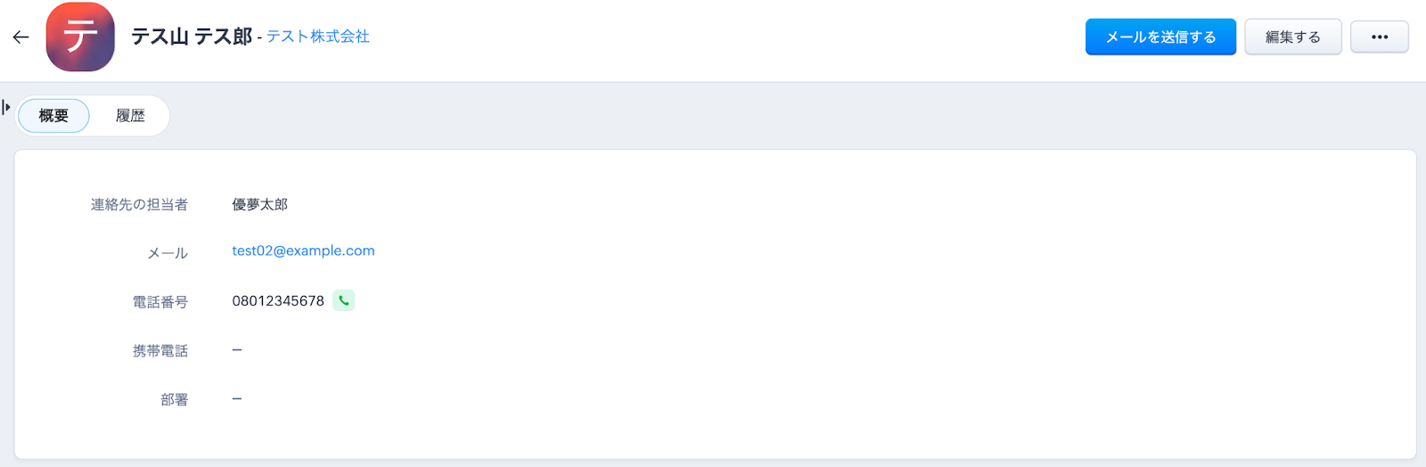 事前準備としてZoho CRMに連絡先を作成しておきましょう。 今回はテスト用に、以下の内容で作成しました。