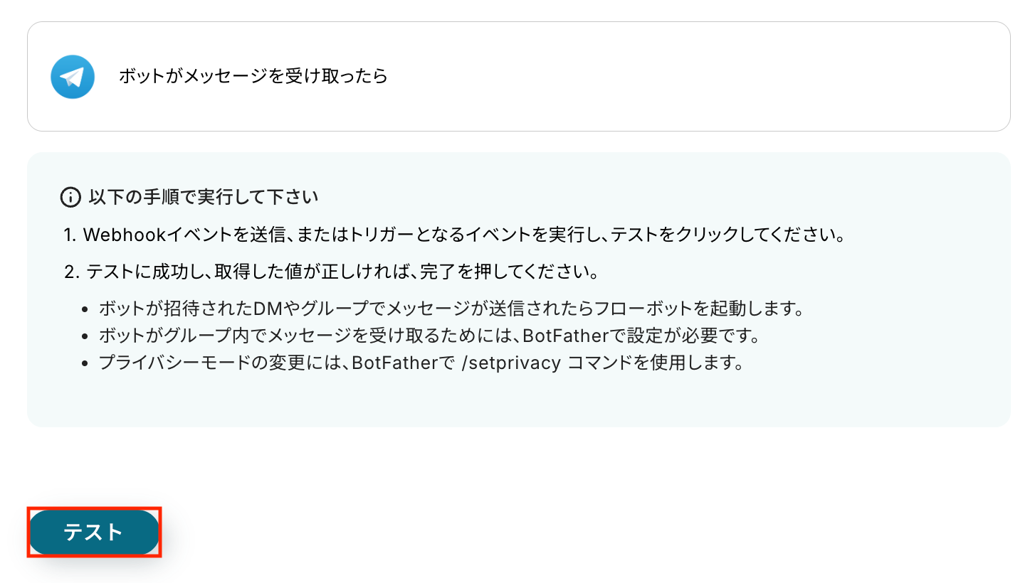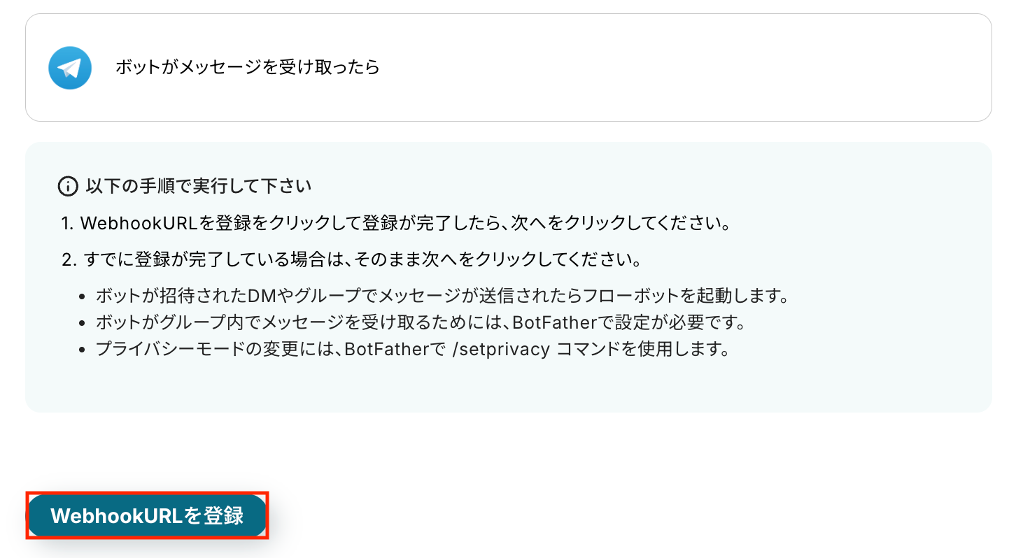 「WebhookURLを登録」をクリックして、YoomがTelegramからWebhookを正しく受け取れるか確認しましょう。 Webhookを受け取るには、プライバシーモードの変更が必要です。