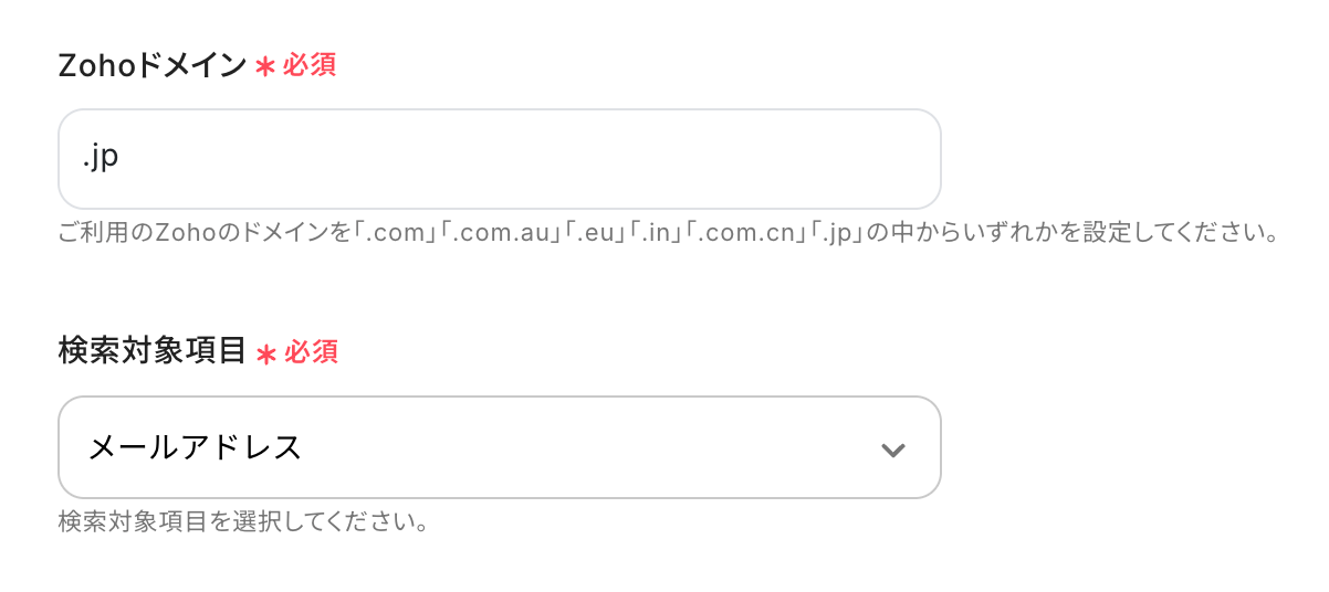 抽出した値は、Zoho CRMの「連絡先を検索」アクションで指定できる検索項目にあわせて利用できます。