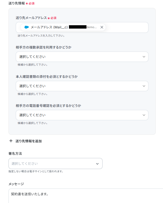 - 最後に、オペレーションでfreeeサインの「契約書を送信」アクションを設定し、作成した契約書を指定の宛先に自動で送信します。