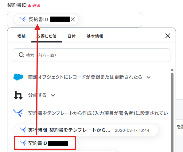 - Googleフォームのトリガー設定では、連携したいフォームのIDを任意で設定できるほか、契約書に反映させたい特定の回答項目のみを取得することも可能です。