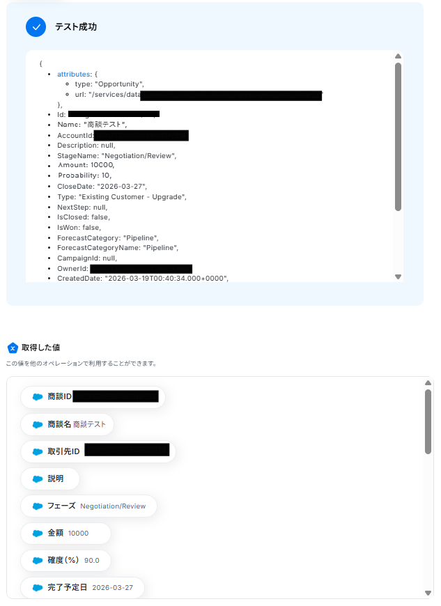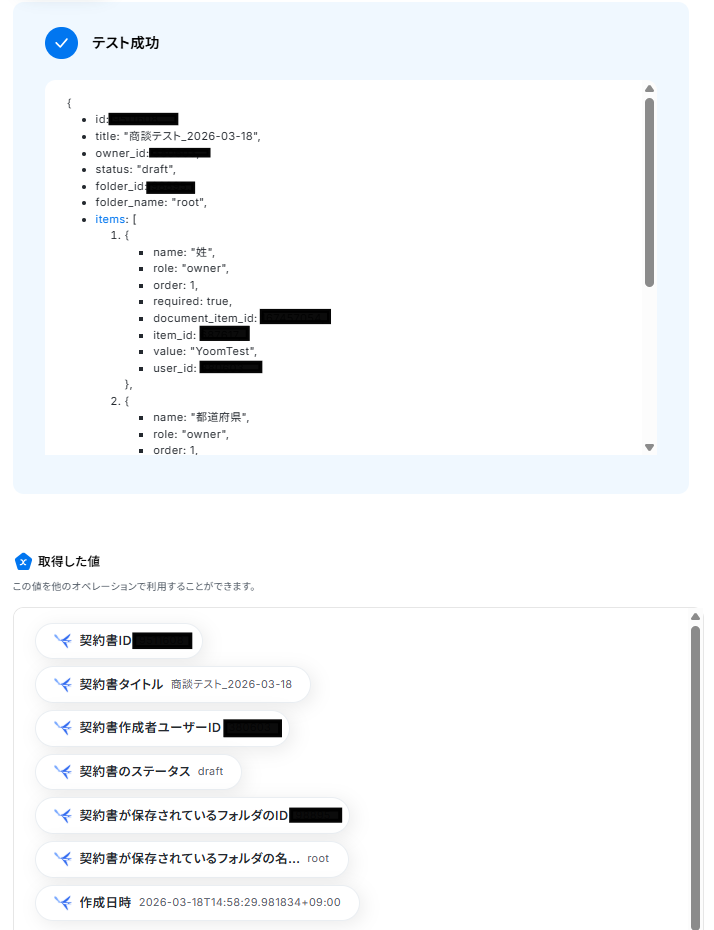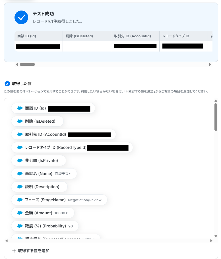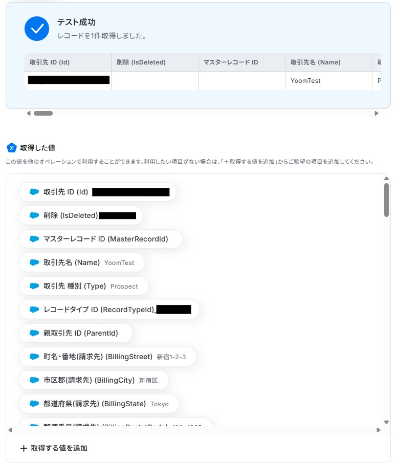 テストに成功すると、「取得した値」に情報が追加されます。