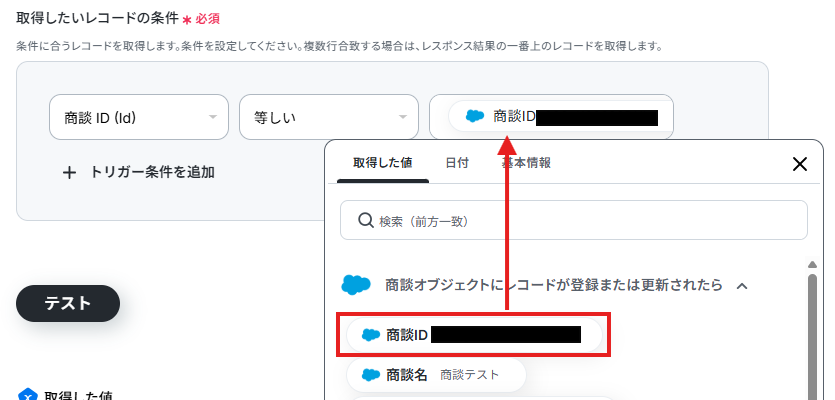 取得したいレコードの条件は以下のようにステップ4で取得した値を活用して設定します。