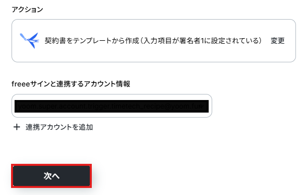 - その後、オペレーションでfreeeサインの「契約書をテンプレートから作成」アクションを設定し、取得した情報をもとに契約書を作成します。