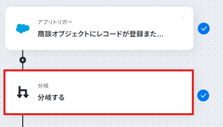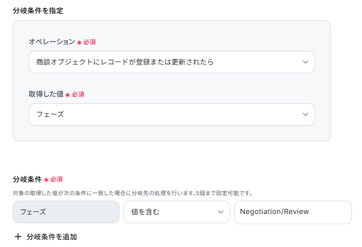 - 次に、オペレーションで分岐機能を設定し、商談が特定のフェーズになった場合のみ後続の処理に進むようにします。