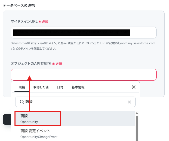 オブジェクトのAPI参照名は候補から選択してください。オブジェクトのAPI参照名の確認方法もあわせてご確認ください。