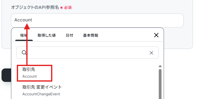 オブジェクトのAPI参照名は候補から選択してください。ここでは取引先を設定しています。