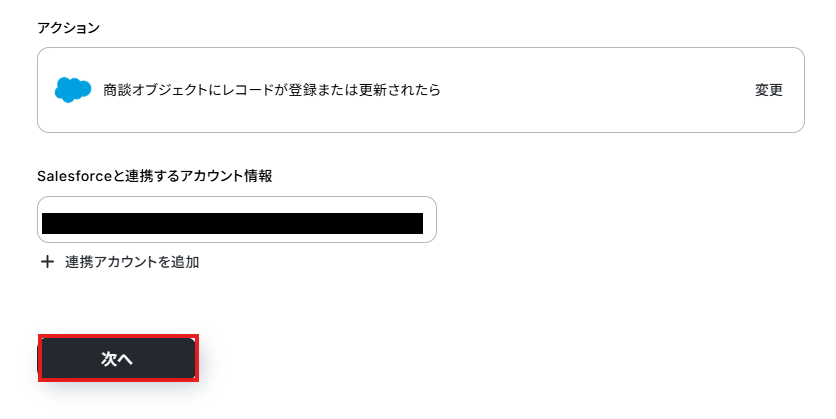 アクションは変更せず、アカウント情報がマイアプリ連携をしたアカウントと一致することを確認したら、「次へ」をクリック。