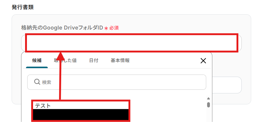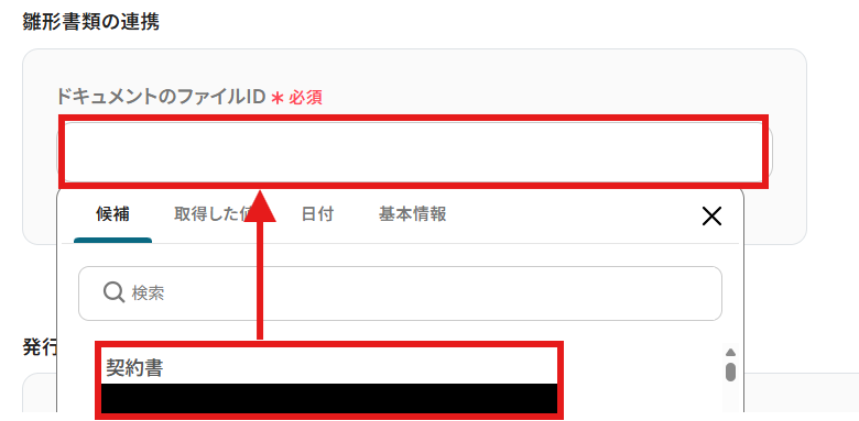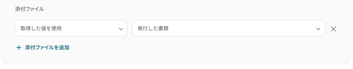 「メール内容」で「添付ファイル」に「取得した値を使用」と「発行した書類」を設定してくださいね。