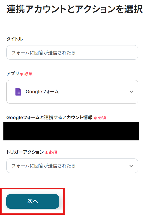 タイトルと連携するアカウント情報を確認し、アクションはテンプレート通りのまま「次へ」をクリックして進んでください。