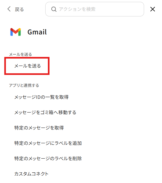 下記の画面でGmailと検索し、該当のアクションを設定してください。