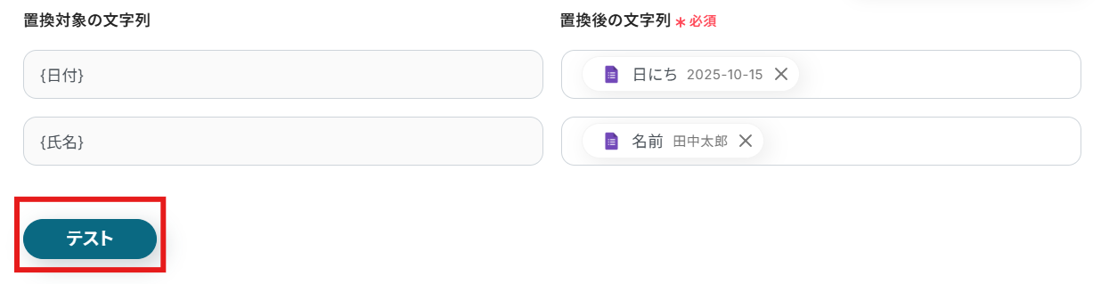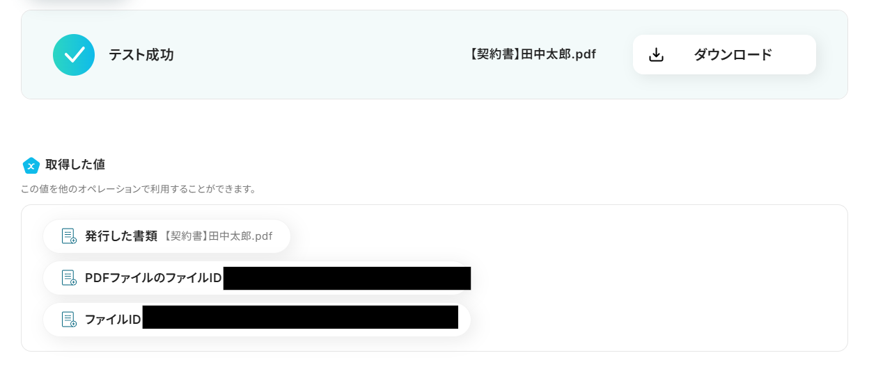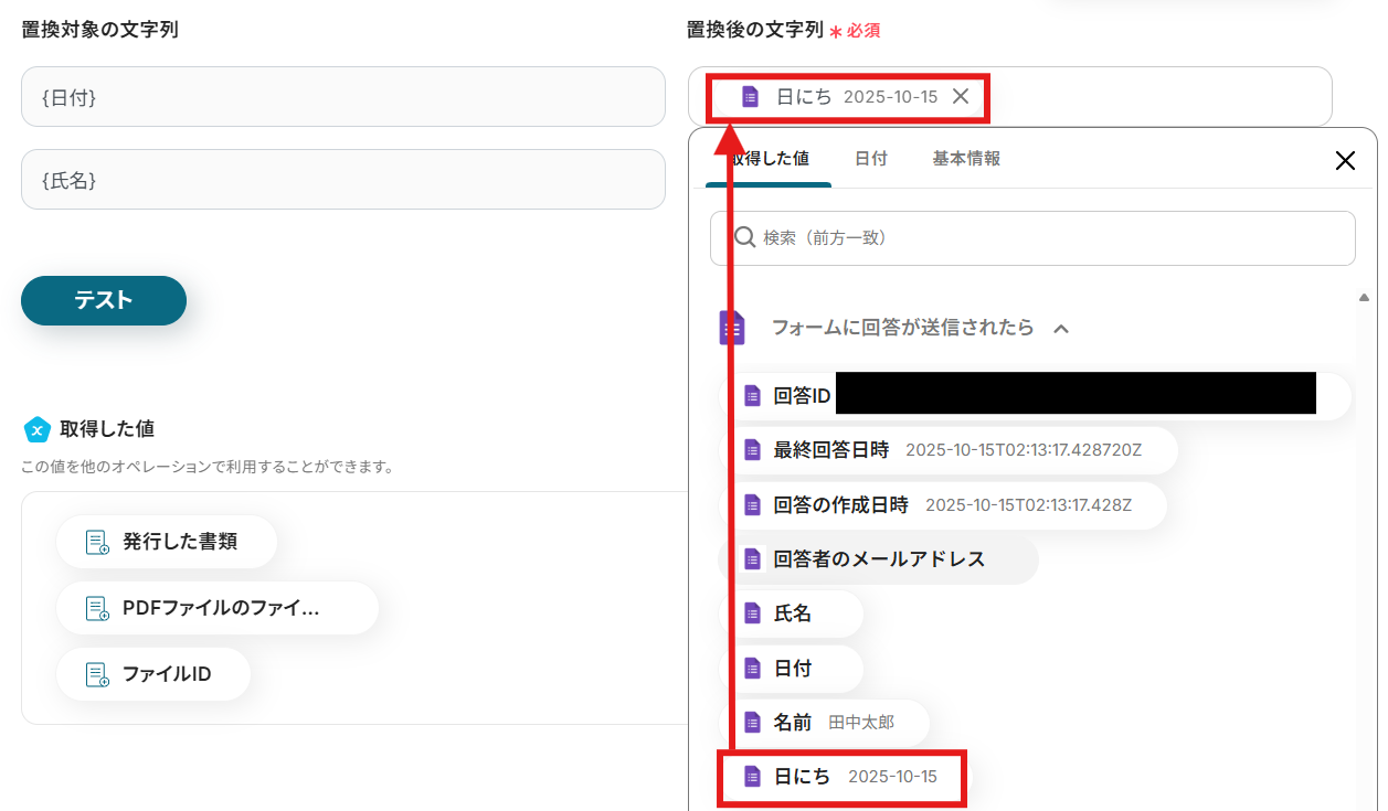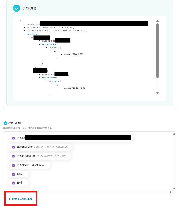テストに成功すると「取得した値」に反映されます。「取得した値」について、詳しくは以下をご覧ください。