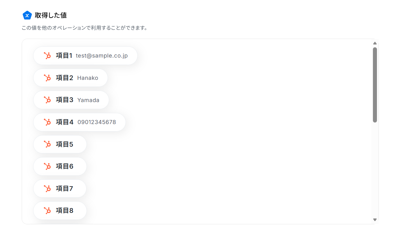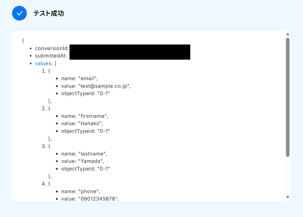 テストに成功すると「取得した値」にHubspotフォームの情報が反映されます。