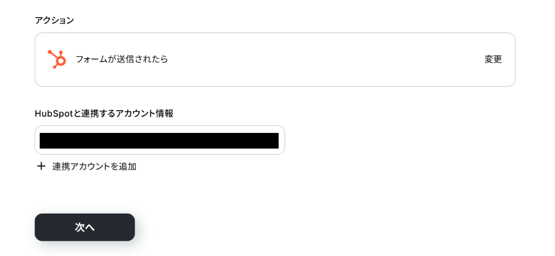 (2)HubSpotと連携するアカウント情報に誤りがないかを確認し、アクションは「フォームが送信されたら」のままで「次へ」をクリックしましょう。