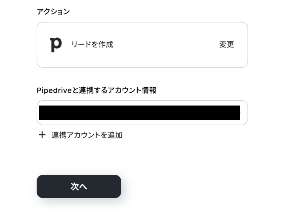 (2)Pipedriveと連携するアカウント情報に誤りがないかを確認し、アクションは「リードを作成」のままで「次へ」をクリックしましょう。