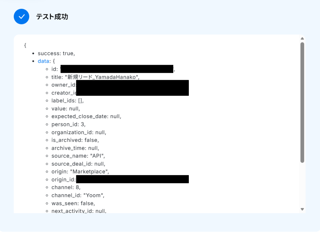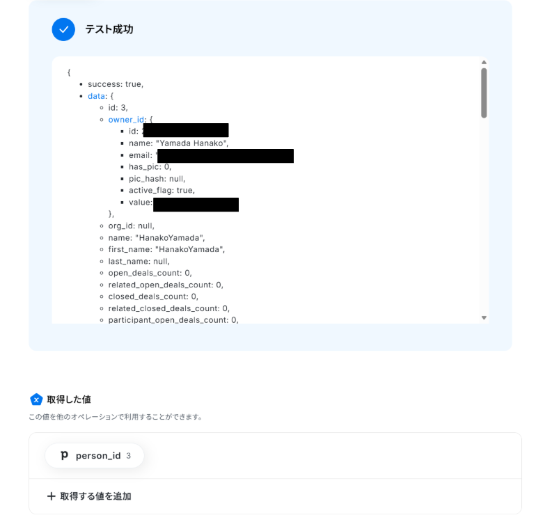 テストに成功すると、取得した値にPipedriveの人物情報が追加されます。