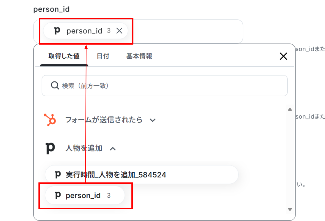 「person_id」をPipedriveの「人物を追加」アクションで取得した値を使って入力します。