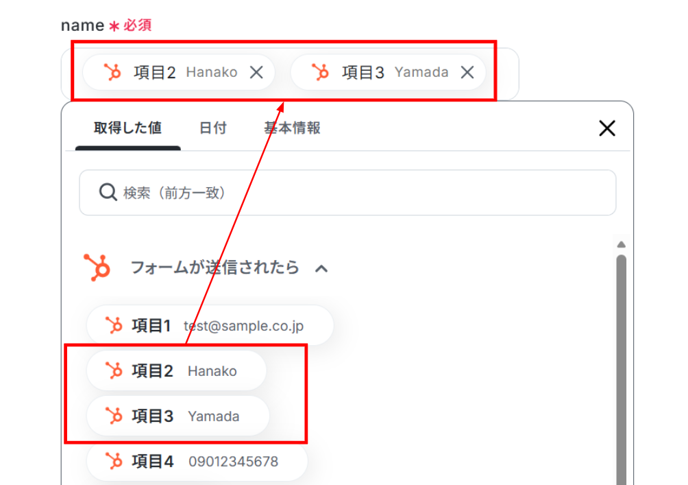 (3)「name」にHubSpotで取得した値を使って入力します。