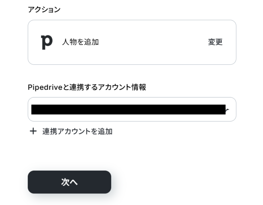 (2)Pipedriveと連携するアカウント情報に誤りがないかを確認し、アクションは「人物を追加」のままで「次へ」をクリックしましょう。