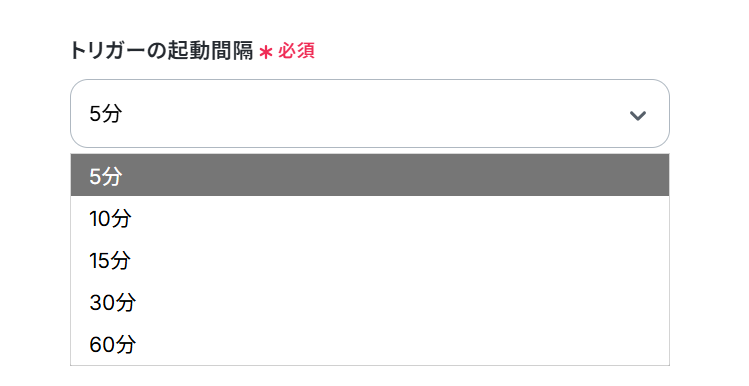 - トリガーは5分、10分、15分、30分、60分の間隔で起動間隔を選択できます。