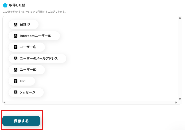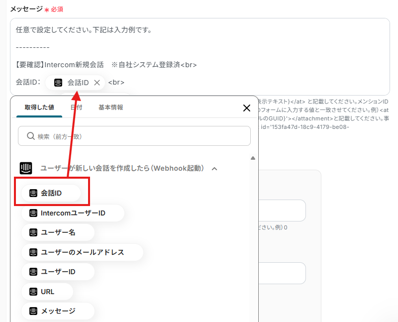 ※入力欄をクリックすると前のステップで取得したIntercomの値を選択できます。