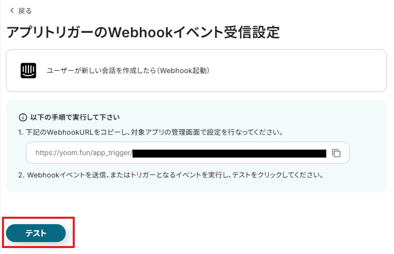 その後、Webhookイベントを送信、またはトリガーとなるイベントを実行した後、[テスト]をクリックしましょう。